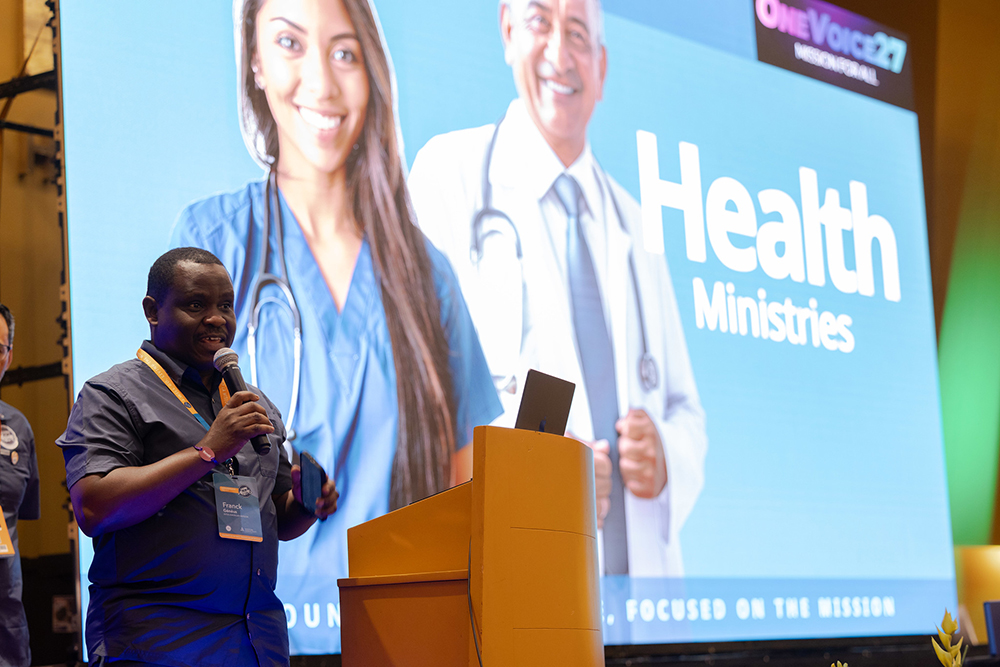 El doctor Franck Geneus, director de ministerios de salud de la División Interamericana, describe las iniciativas que apoyan el enfoque misional de la iglesia en los próximos cinco años, durante la cumbre de liderazgo de la División Interamericana en Riviera Maya, México. [Fotografía: Daniel Gallardo/DIA]