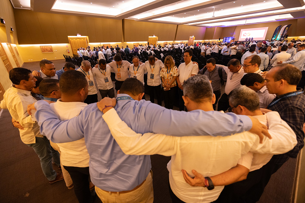 Los administradores de la iglesia en la Unión Colombiana del Norte oran juntos por la iniciativa Impacto 2028 durante la cumbre de liderazgo de la División Interamericana, comprometiéndose a establecer hasta cien mil lugares de predicación en todo el territorio. [Fotografía: Daniel Gallardo/DIA]