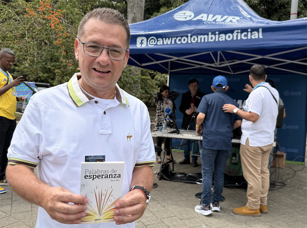 Carlos Arcilla, secretario de Paz y Derechos Humanos de la Alcaldía de Medellín, visita los micrófonos de Radio Mundial Adventista Colombia y recibe el libro misionero del año, Palabras de Esperanza. [Fotografía: Comunicaciones de la UCN]