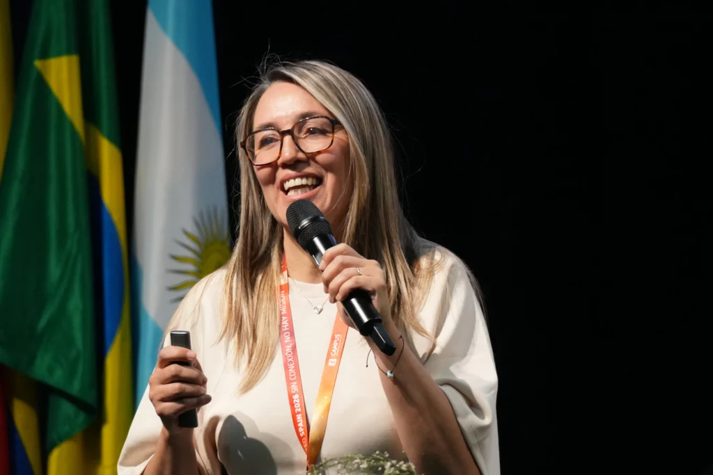 Maijo Roth comparte los resultados de su investigación sobre el impacto del servicio misionero en niños y adolescentes durante el Congreso Internacional de Misión I Will Go en España. [Fotografía: Marcos Paseggi, Adventist Review]
