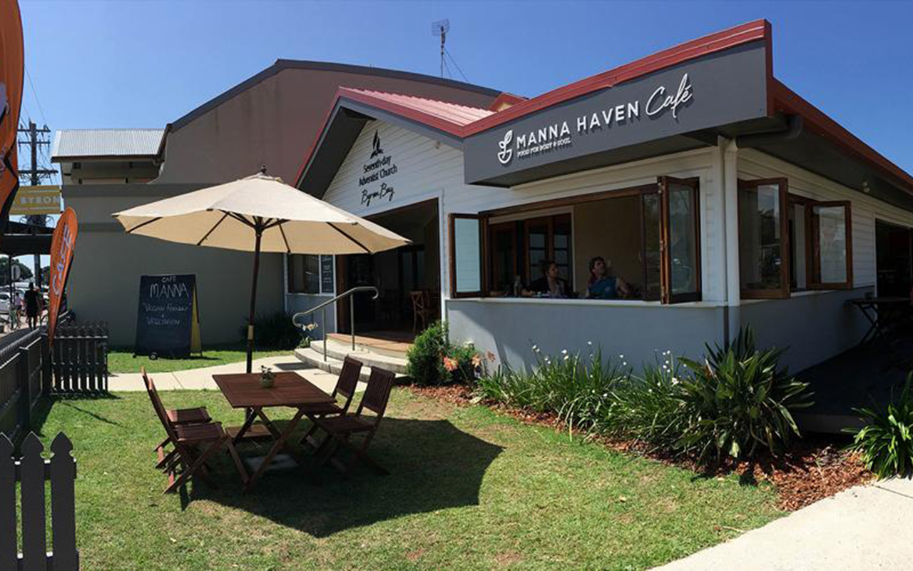 Le café Manna Haven a remporté le Certificat d’Excellence TripAdvisor en 2014 et 2015 et figure actuellement au premier rang des 130 restaurants de Byron Bay sur le site web de TripAdvisor. Cette bénédiction et les nombreuses histoires personnelles de cœurs touchés et transformés par le Saint-Esprit sont des témoignages de ce que Dieu peut faire lorsque la vision, le dévouement et le travail intense, motivés principalement par le désir de présenter Jésus aux autres, sont placés entre ses mains. L’église adventiste du septième jour de Byron Bay est devenue « l’autre phare » de la ville.