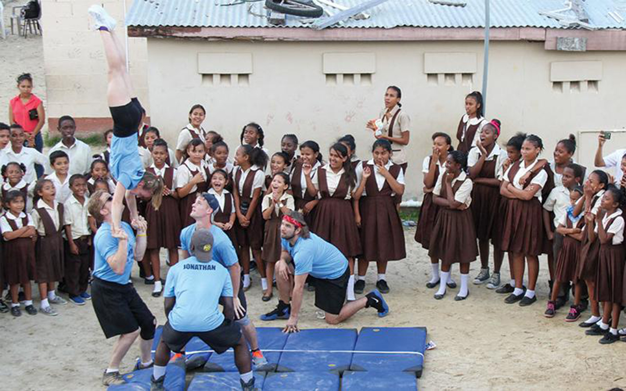 Annika Northrop et ses coéquipiers entourés des élèves de l’école primaire de Ladyville, au Belize, lors d’un spectacle de gymnastique. Pour Mme Northrop, ce fut une immense bénédiction que d’être en mesure d’utiliser les talents que Dieu lui a donnés pour offrir inspiration, encouragement et bonheur. Une photo de Scott Spicer de Southern Tidings.