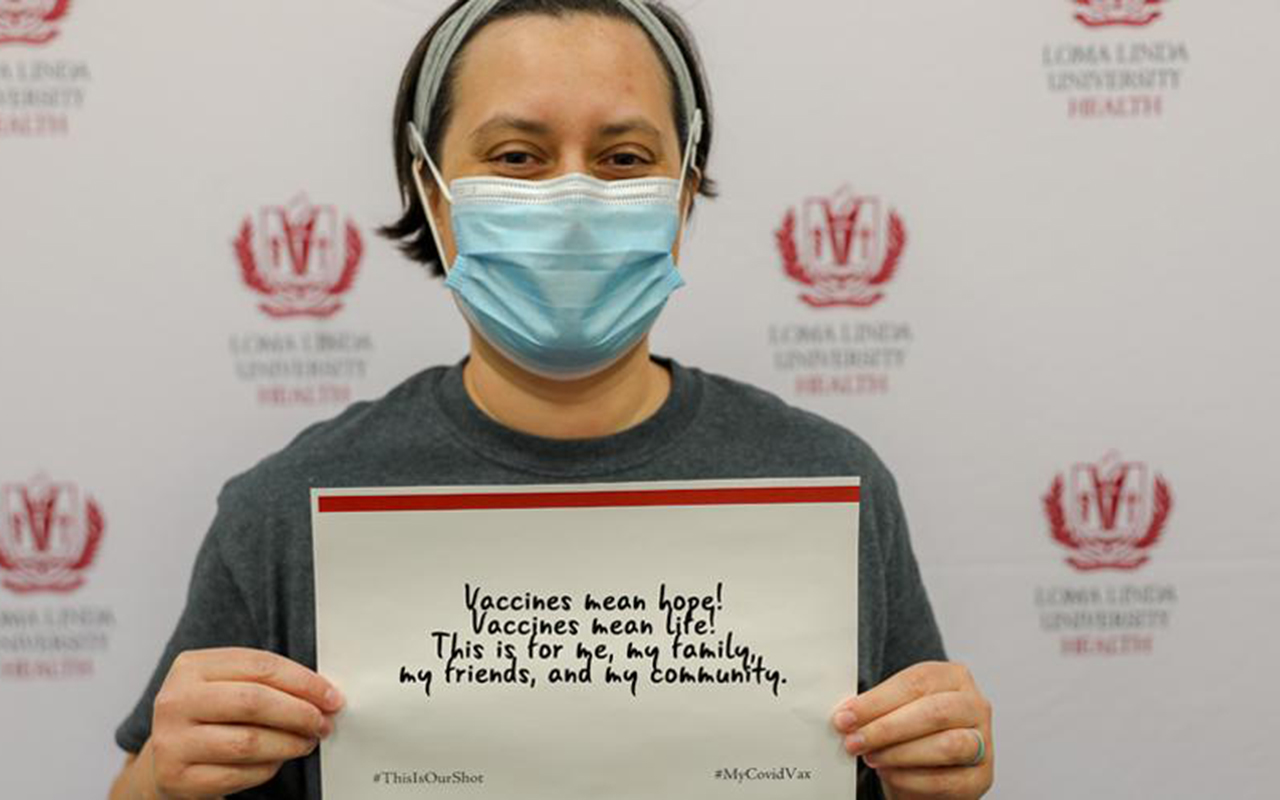 « Les vaccins représentent l’espoir! Les vaccins représentent la vie! Je l’ai reçu pour moi, ma famille, mes amis et ma communauté. » Voilà ce qu’a dit Jennifer Quach, qui travaille aux soins de maternité du Centre médical de l’Université de Loma Linda (LLUH pour Loma Linda University Health). Le fils de Mme Quach souffre du syndrome congénital d’obstruction des voies aériennes supérieures, une maladie rare qui bloque les voies respiratoires et les cordes vocales. Elle lui attribue une grande partie de sa motivation de recevoir le vaccin.