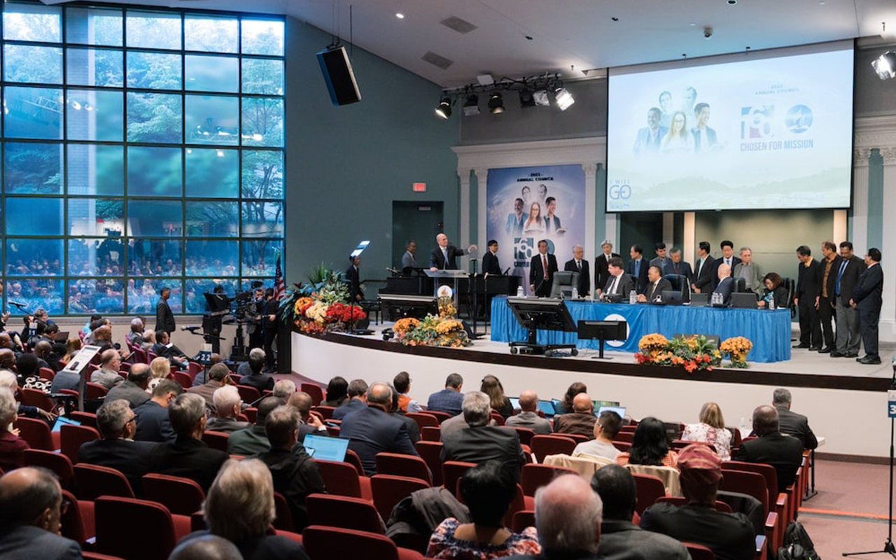 Les dirigeants des régions de l’Église qui ont participé au vote d’une réorganisation territoriale montent sur la scène après le vote du 8 octobre au Concile annuel de Silver Spring, Maryland, États-Unis. [Une photo de Lucas Cardino / AME (CC BY 4.0)]