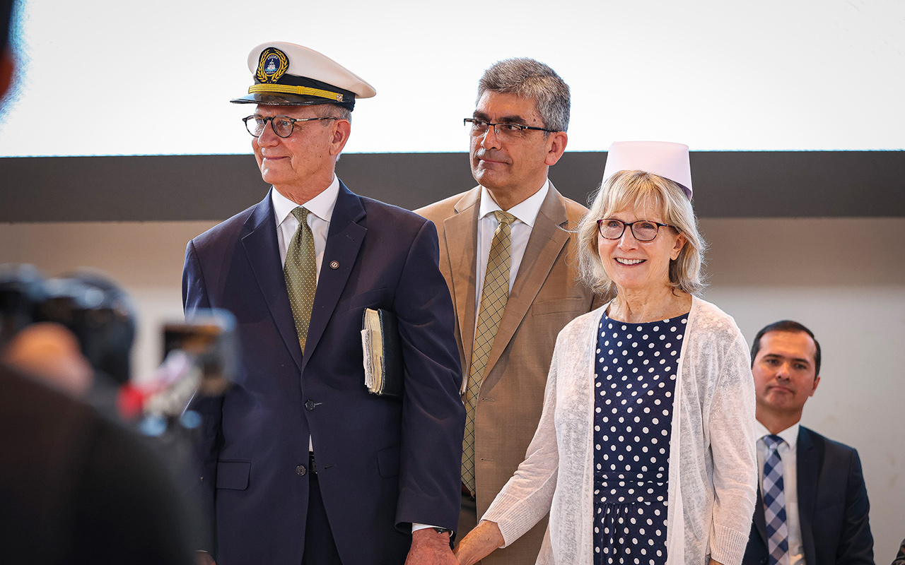 Ted Wilson portant une casquette de capitaine lors d’une cérémonie au Collège adventiste Amazonia. Il est accompagné par sa femme, Nancy, et son adjoint, Magdiel Pérez Schulz. [Une photo de John Sousa]