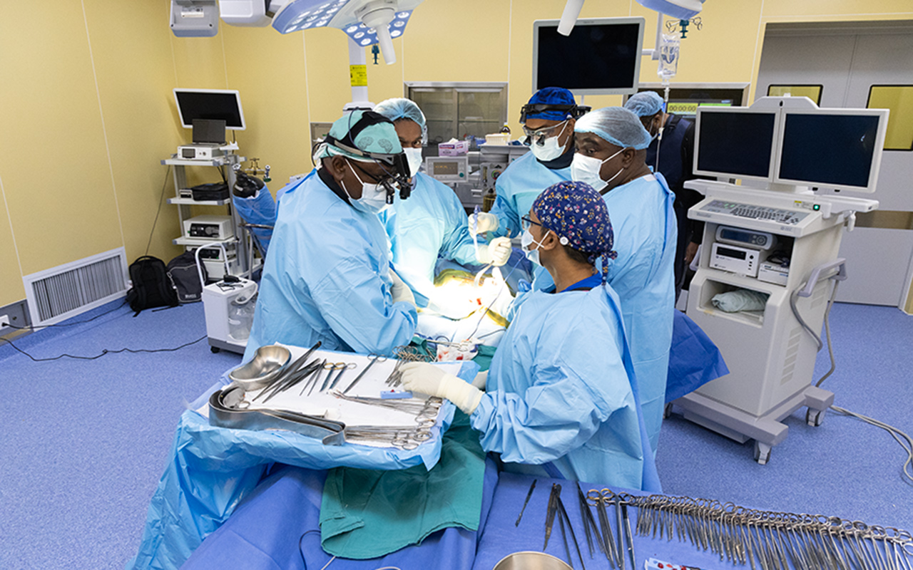 Dr J. Geoffrey Liburd, chef du service de neurochirurgie de l’AMH, a dirigé cette intervention pionnière. Dr Liburd est un neurochirurgien spécialiste et un chirurgien du rachis qui a été formé à l’Université des Antilles, à l’École d’Infirmerie Générale à Leeds au Royaume-Uni et à l’Université de Yale aux États-Unis. Dr Liburd, originaire de Saint-Kitts-et-Nevis, a qualifié cette intervention de réussite.