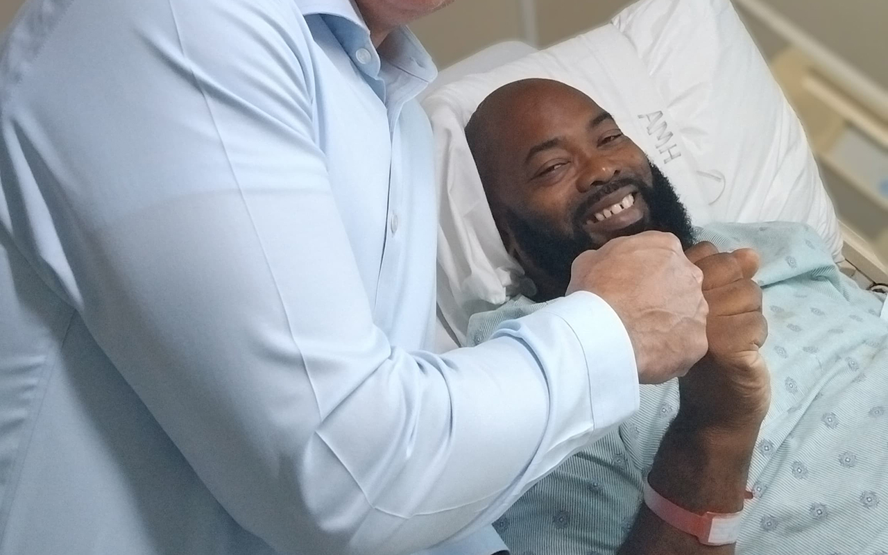 Dr Roy McGregor fait un poing contre poing avec son patient Steve Lawrence le lendemain de sa prostatectomie radicale laparoscopique avec préservation des nerfs assistée par robot collaboratif, le 30 mai 2024. [Photo : Avec l’aimable autorisation du Dr Roy McGregor]