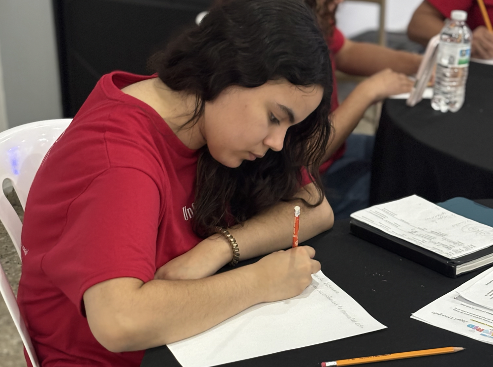 Une jeune participante écrit une lettre à un détenu lors des activités communautaires organisées dans le cadre du congrès. [Une photo de la Fédération du nord de Porto Rico]